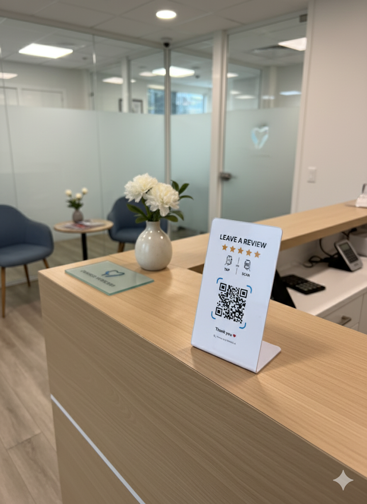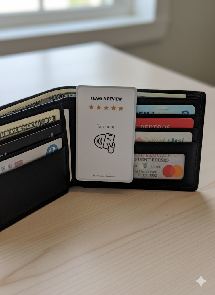 NFC/QR Review Card: 85.5 × 54 mm (credit-card size), double-sided (NFC/QR Code).